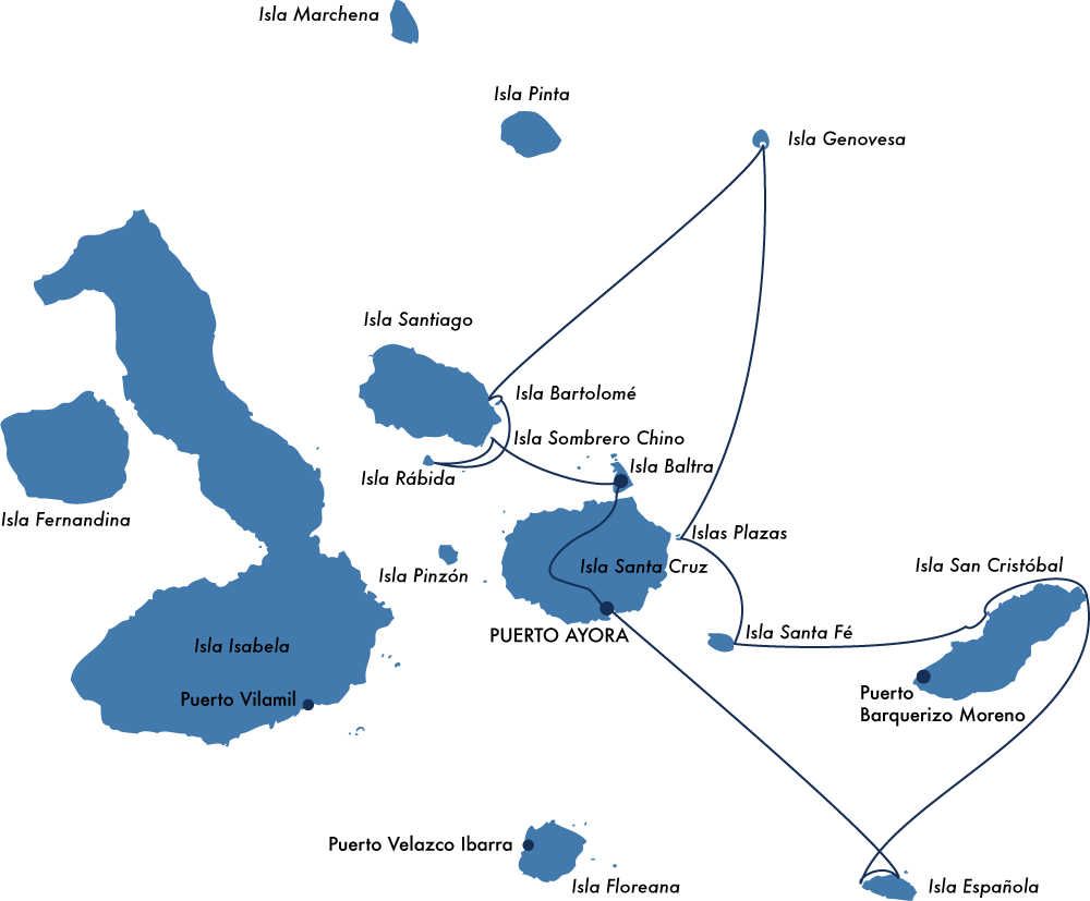 The Integrity Eastern Route focuses on the eastern, geologically older islands of Española, San Cristóbal, Santa Fé, Plazas, and Genovesa. Their volcanoes are long dormant, their tops weathered and slopes colonized with a wide array of Galapagos plant life. You'll be able to contrast these islands with the dramatic landscapes of the very young lava flow (about 100 years old) we cross at Sullivan Bay and the cinder cone we climb on Bartolomé.